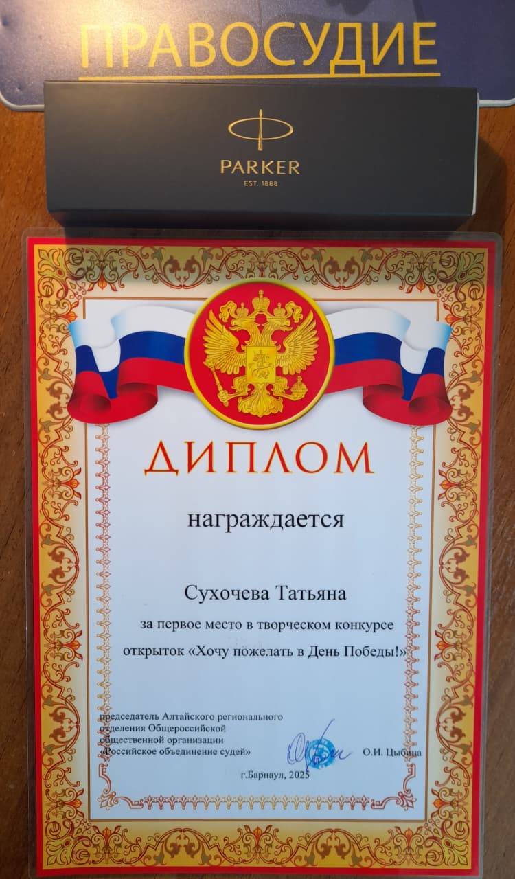 23.09.2025 на оперативном совещании суда председателем суда Четвертных А.В. вручен секретарю судебного заседания Сухочевой Светлане Владимировне диплом, которым её дочь Сухочева Татьяна награждена за первое место в творческом конкурсе открыток «Хочу пожелать в День Победы!», а также памятный подарок.